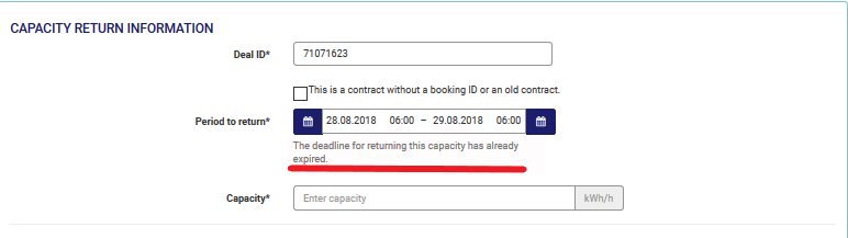 A capacity surrender can be requested directly after your capacity is booked. To find out the latest time before capacity runtime that you can request a surrender, you must check the website of the regarding TSO. When it is too late to surrender a capacity, the platform will not allow you start the surrender request and the following message is displayed:
