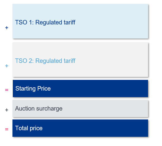 The total price of the auction consists in (1) the starting price plus (2) the auction surcharge, if there are any. If the product is unbundled, then the starting price is the regulated tariff of the TSO plus additional fees, if applicable. If the product is bundled, then the starting prices is the sum of the regulated tariff and the additional fees of both TSOs.