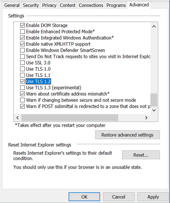 c.Enable (check) TLS 1.2 and also disable (uncheck) SSL 3.0 for additional security;