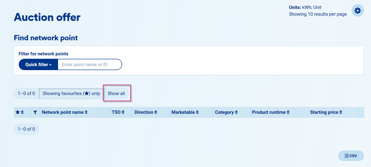 By default, PRISMA displays auctions and trade proposals at your favourite network points. However, you can change it at any time by clicking the “Show all” button at the top of each table.