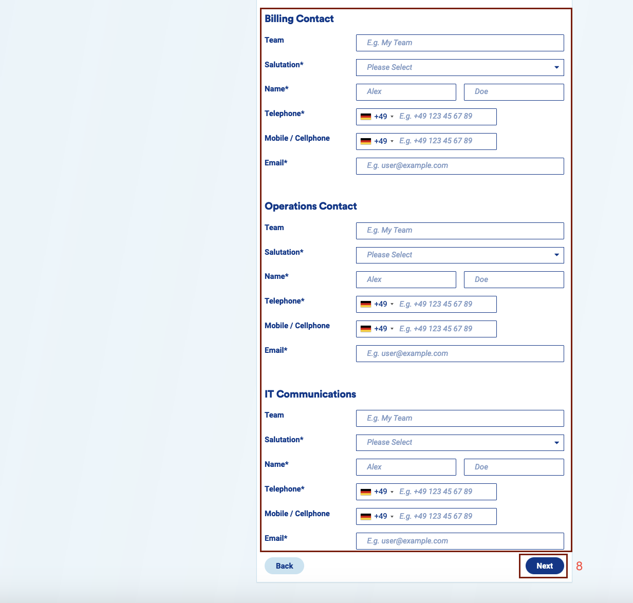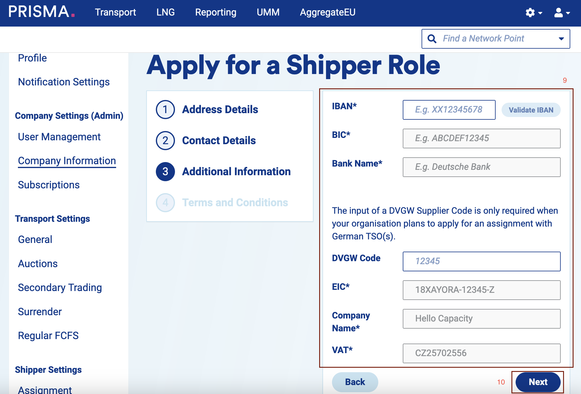 9. In the third step, please provide the follow information: (a) IBAN, (b) the DVGW code, if applicable, (c) the EIC, (d) the registered company name and (e) the VAT;