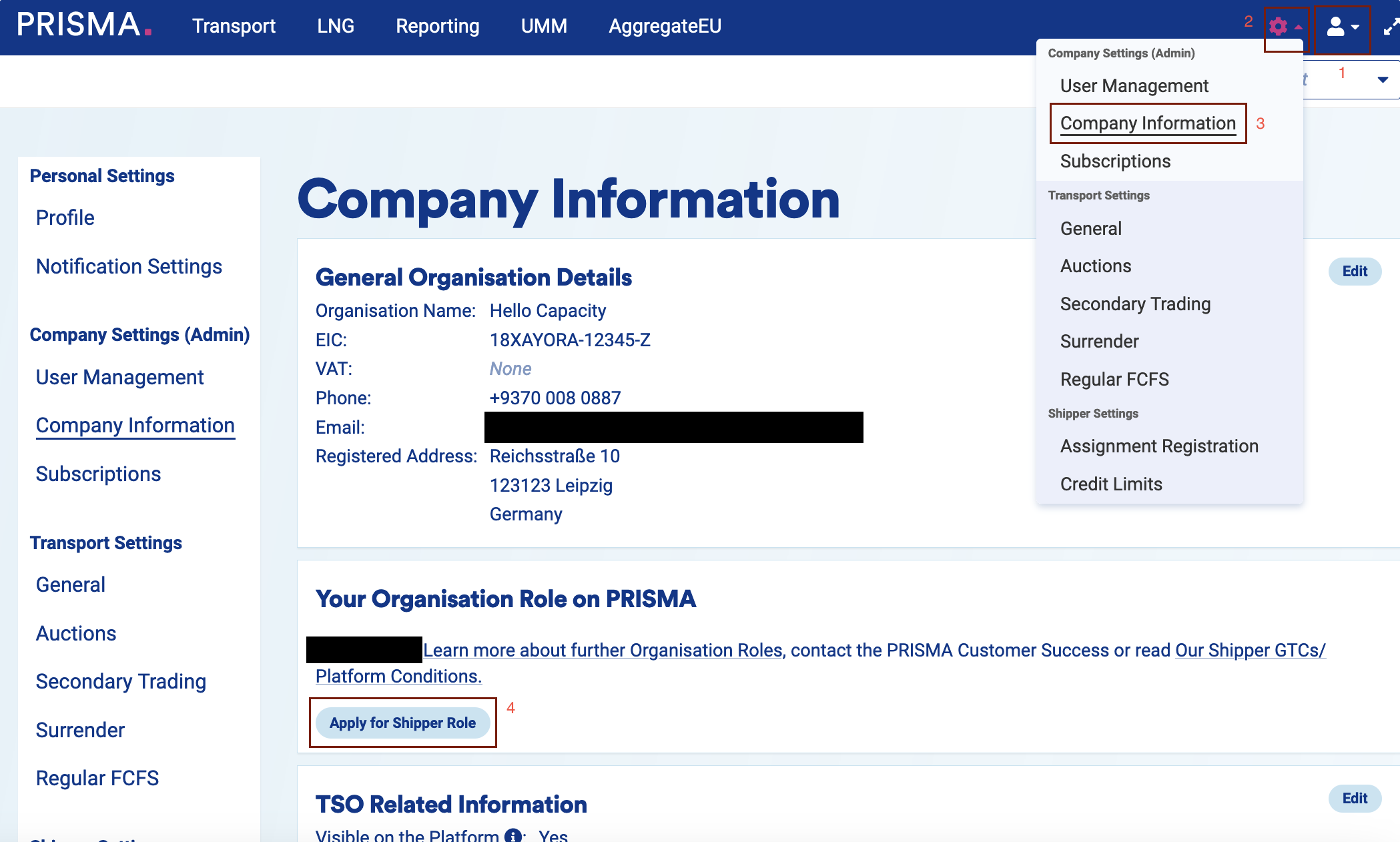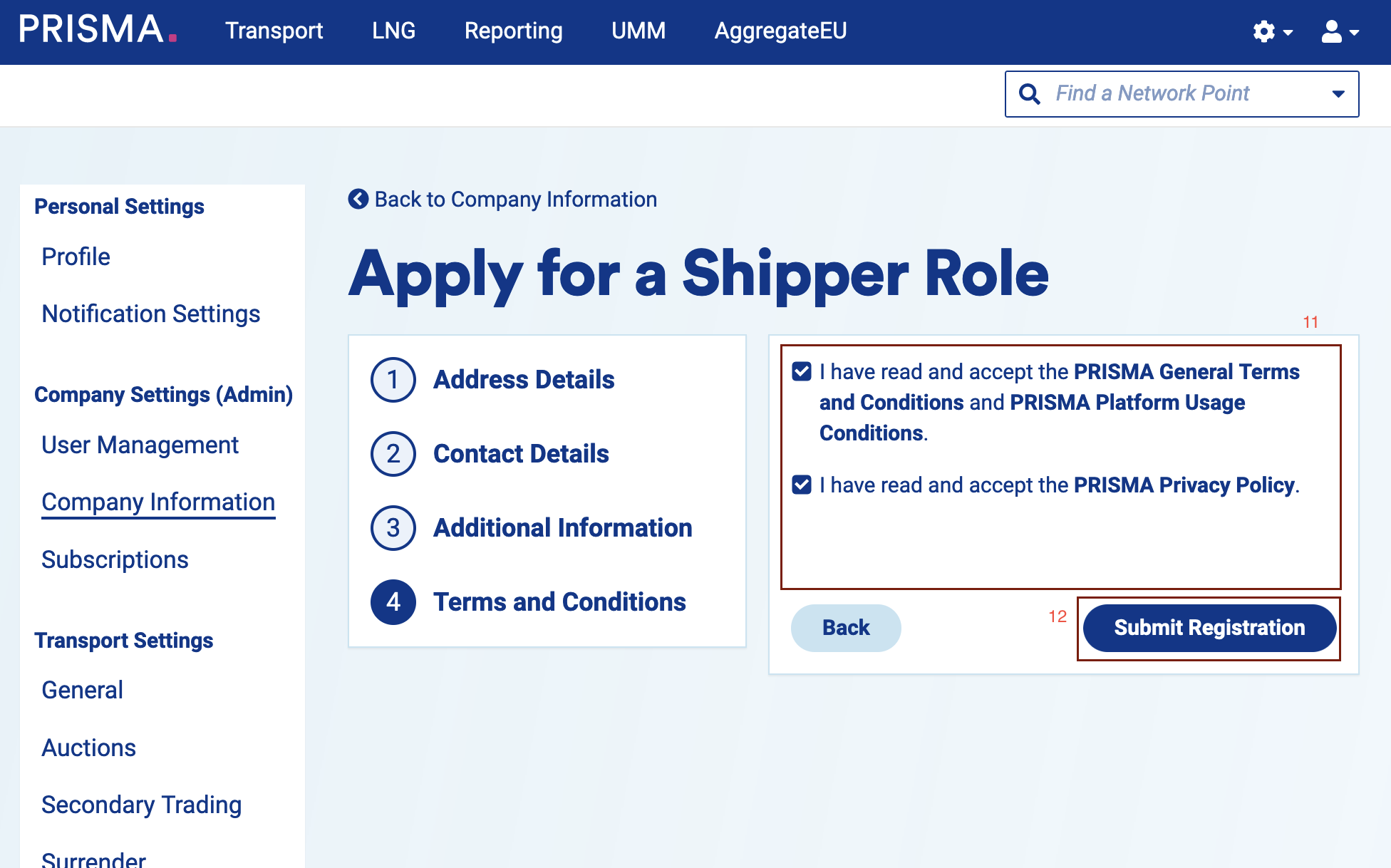 Once you complete this process, you will become a shipper on PRISMA. Now, if you wish to trade with operators you must request assignments. You can find out how to do so here: How to Request Assignments?
