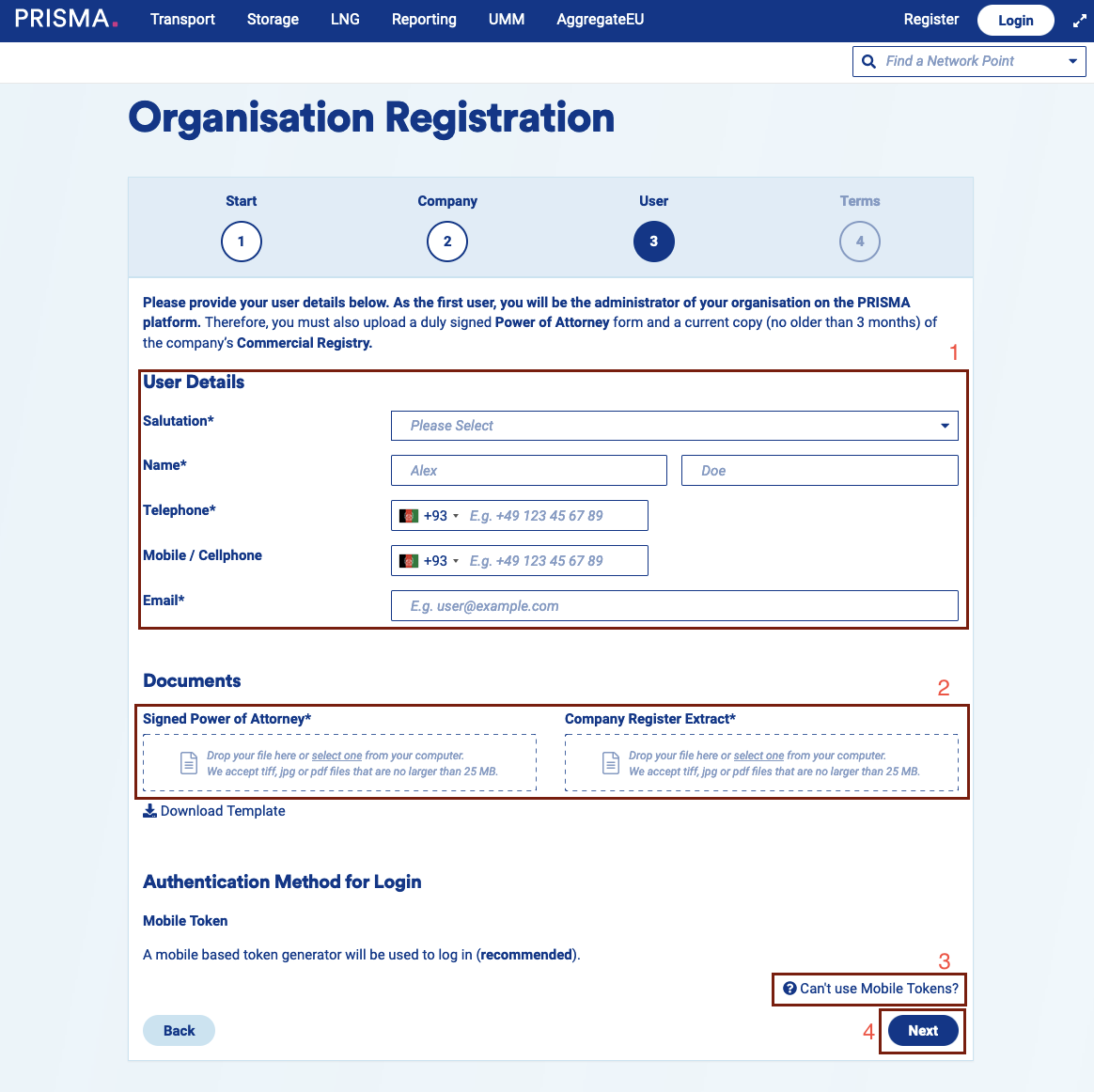 NOTE: If you already have a PRISMA account and wish to reserve Hydrogen capacity, you do not need to register again. You simply need to inform the respective Hydrogen Network Operator for assignment. Once this step is completed, the respective HTNO will inform us to allow your organisation to participate in the Hydrogen FCFS service.