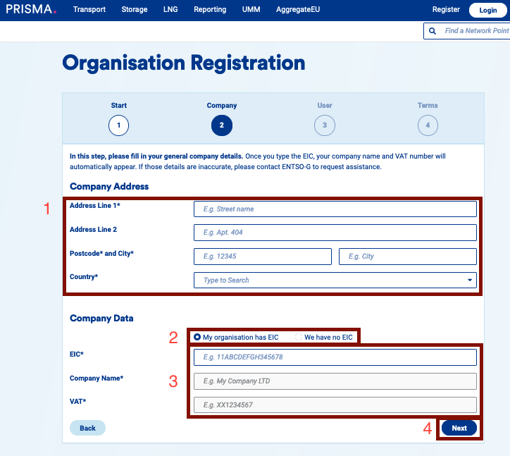 3. If your organization has an EIC, enter it in the appropriate field. The organisation name and VAT will automatically appear. If your organization does not have an EIC, enter your organisation name and VAT manually.