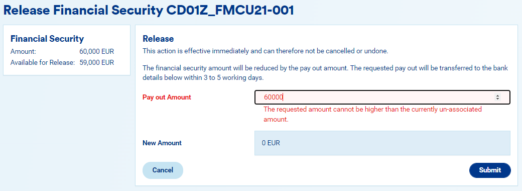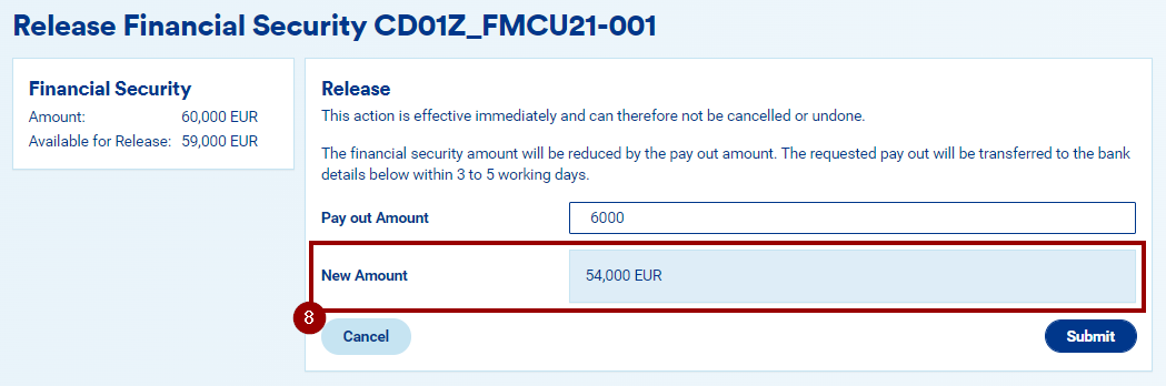 9. Once you have clicked on "Submit", the specified amount will be released and the financial security will be updated with the new value.