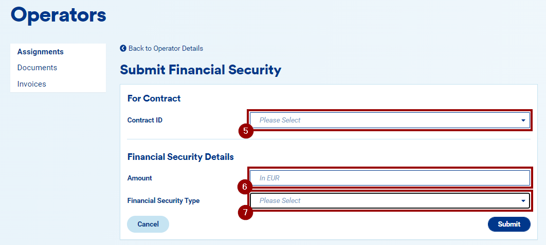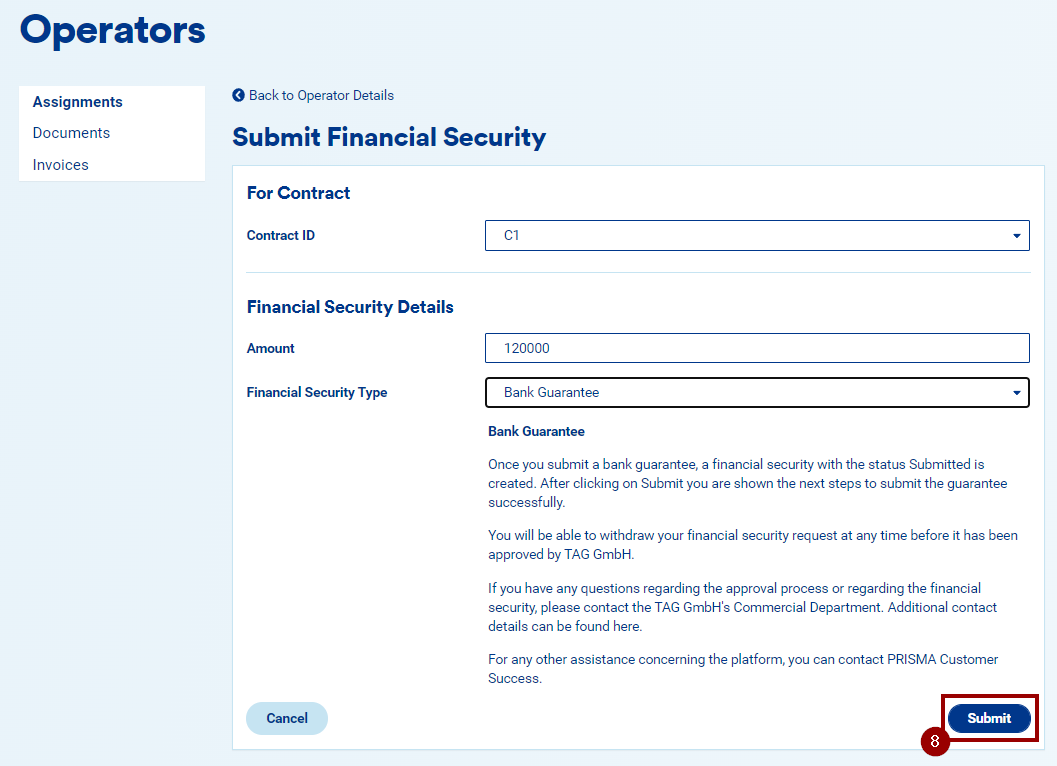 8. Once you have inserted these details, click on "Submit" to submit the financial security.