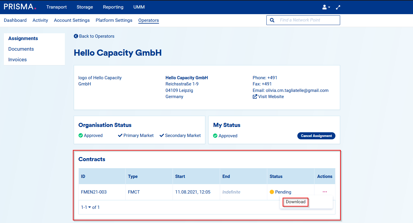From 2022, PRISMA will offer a Contract Management Service to the transmission operators. Should an operator with which you have an assignment subscribe to this service, you will be to view and download your contracts (frame contracts, DECT etc.) directly on the platform.