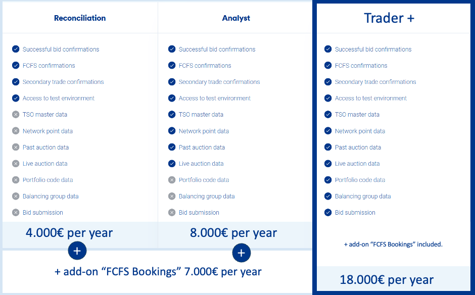We also recently introduced a new functionality: FCFS Bookings. You can buy FCFS capacity directly through the API. This functionality is included in the Trader+ package, as well as an add-on for the Reconciliation and Analyst packages.