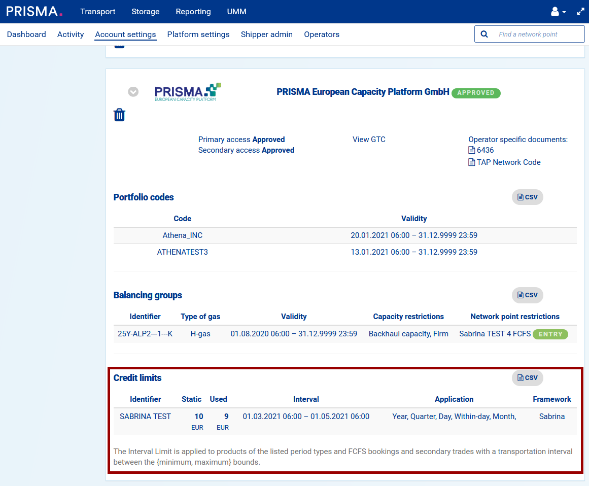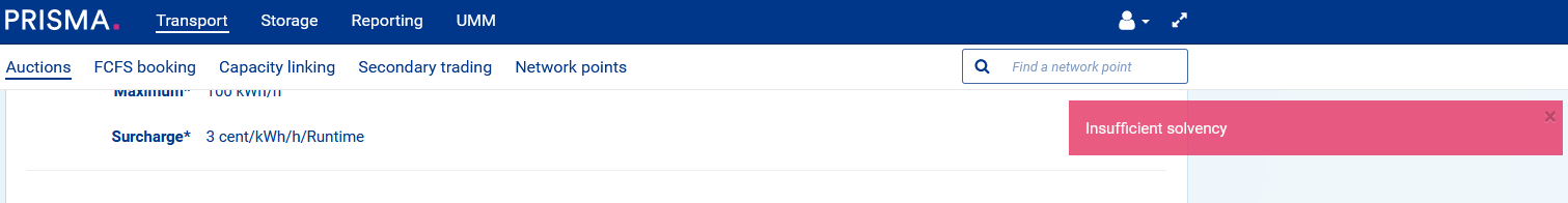 To perform any kind of activities in the primary, secondary or storage markets on PRISMA, you must have a sufficient credit limit if the operator requires a credit check.