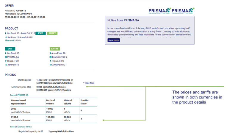 Currently, prices of products marketed on PRISMA are set by TSOs and SSOs, and usually correspond to their national currency. The price currency listed on the PRISMA platform is the same currency referred to in all related contracts with TSOs and SSOs' .