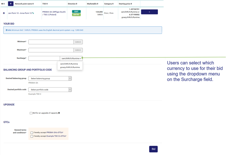 - The display of Alternative Currencies on PRISMA is for convenience purposes only, and each Bid will be deemed to have been submitted in the Base Currency used by the TSO.