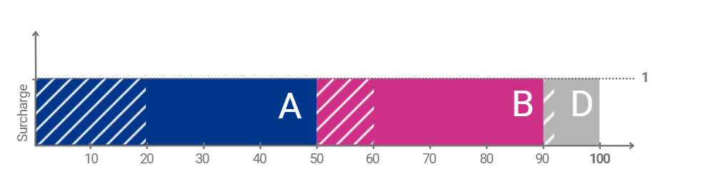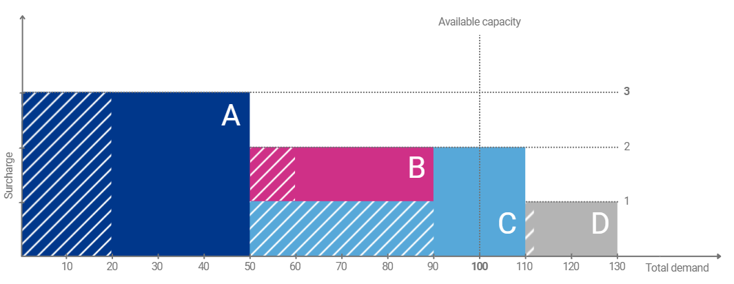 d. If the total sum of maximum requested capacity from all shippers exceeds the available capacity (overdemand), capacity is allocated giving priority to the highest offered surcharge. The surcharge is set by the lowest bid that receives capacity.