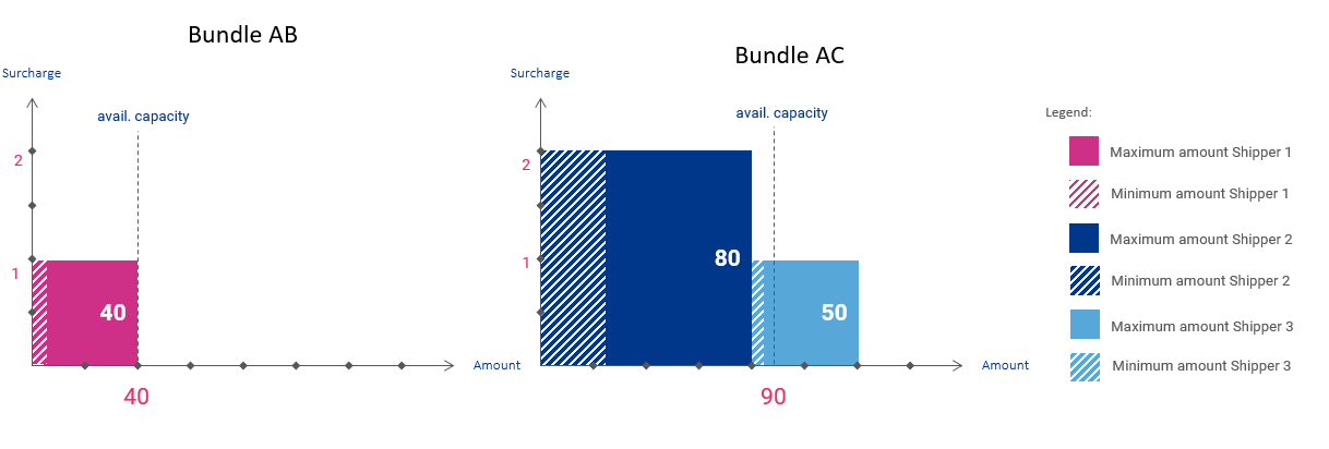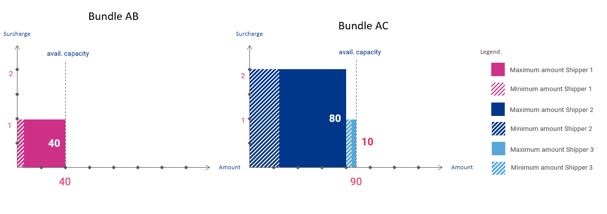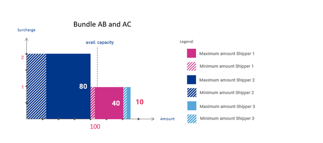 Now, there was an underdemand in auction AC, but an overdemand in the consolidation and ranking of bids. In the consolidated evaluation of bids, the lowest surcharge offered by any shipper that received capacity was 1 (Shipper Pink). Since that price is higher than the surcharge established by the individual auction AC (in this case 0), that will be the clearing price paid by the shippers that participated in that auction (Shipper Pink).