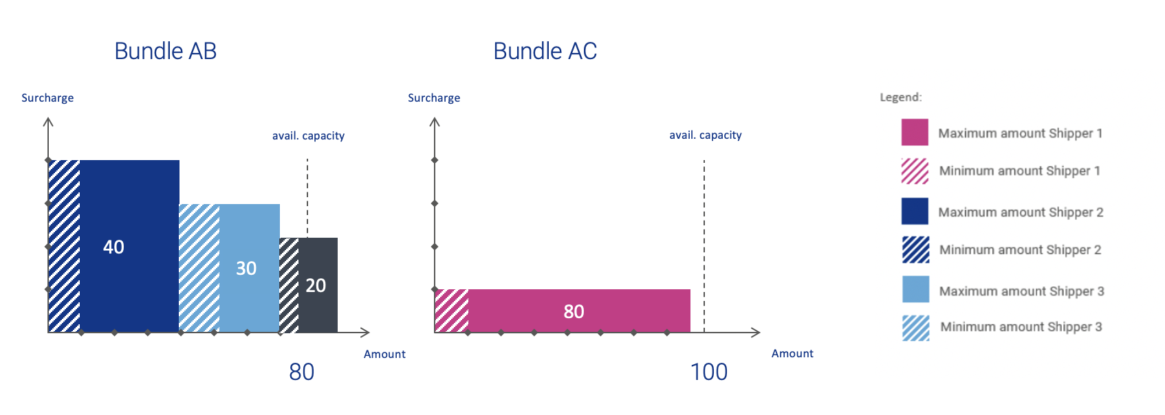 b. In their bids, shippers must set a (1) maximum amount of capacity they wish to buy, a (2) minimum amount of capacity they are willing to buy, and the (3) surcharge they are willing to pay.