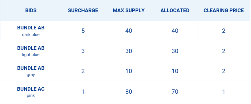 In this case, there was an overdemand in auction AB and in the consolidation and ranking of bids. In that individual auction, the lowest surcharge offered by any shipper that received capacity was 2 (Shipper Gray). Since that price is higher than the price determined by the consolidated evaluation (1), the clearing price of auction AB will be 2.