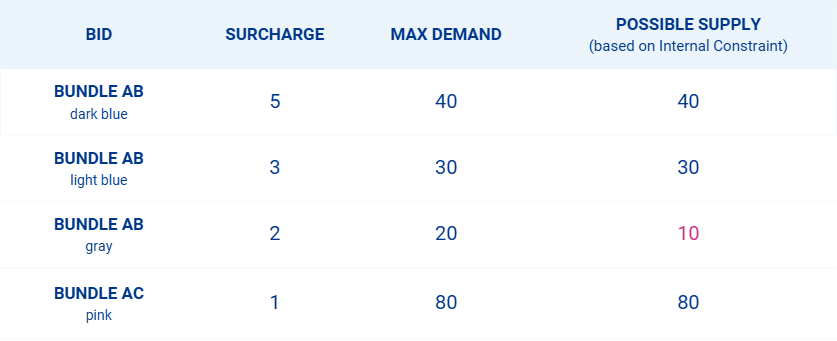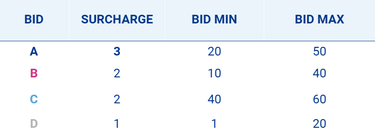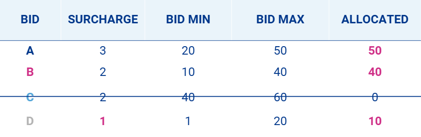 The bids are sorted from highest to lowest surcharge offered, which determines that bid A is allocated its maximum demand (FILL).