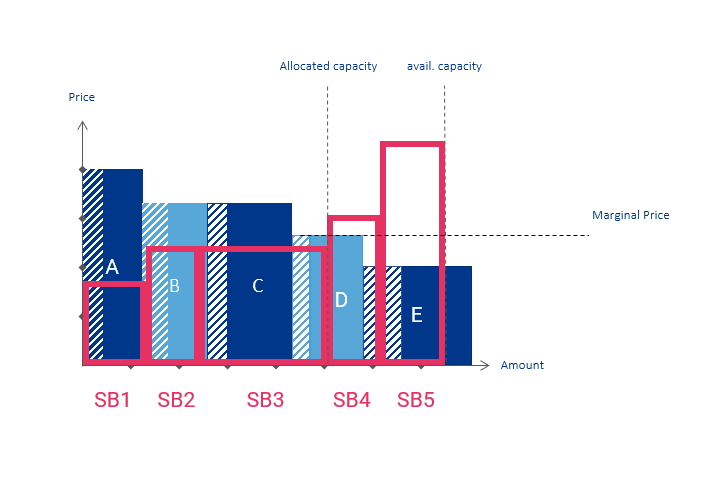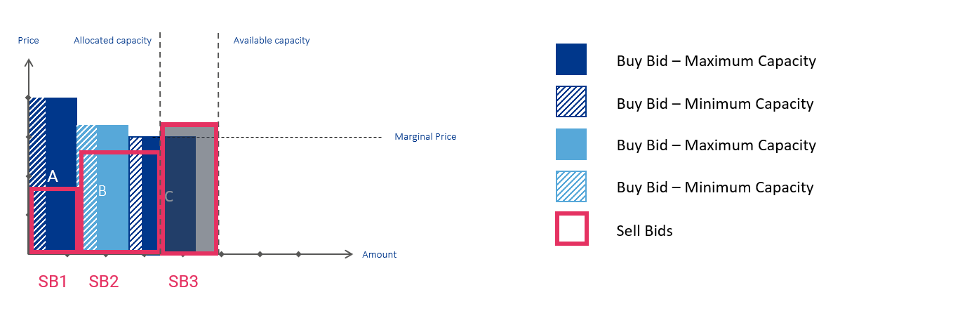 - Fill Procedure in Buy Bids: After the highest buy bids receive their requested capacity, the leftover capacity is allocated to the remaining buyer provided his or her minimum capacity does exceed that amount.