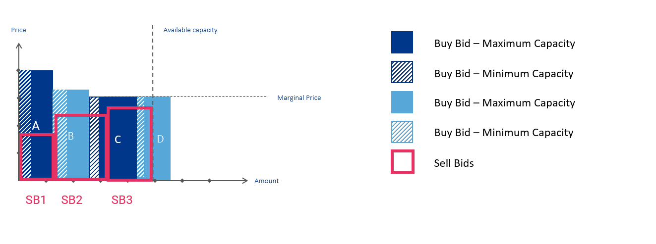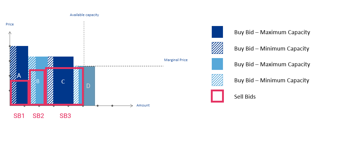 - Fill Procedure in Sell Bids: After the lowest sell bids allocate their capacity, the leftover demand is fulfilled by the remaining offer -- if the buyer's minimum request does not exceed the seller's offer.