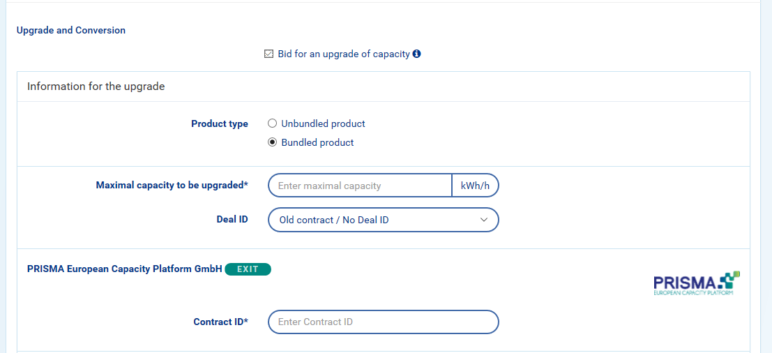 After filling in these fields, continue the bidding process as usual. The responsibility of performing the upgrade as requested now lies with the TSO(s).