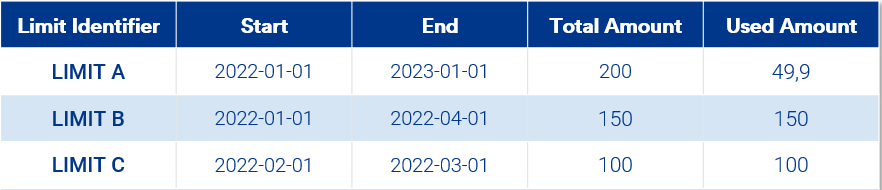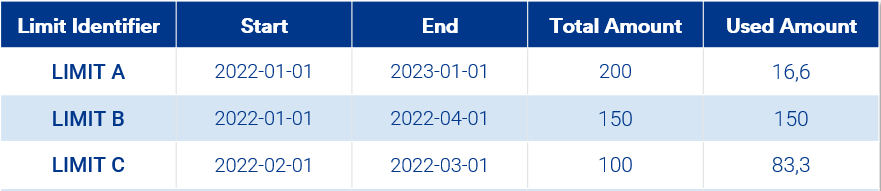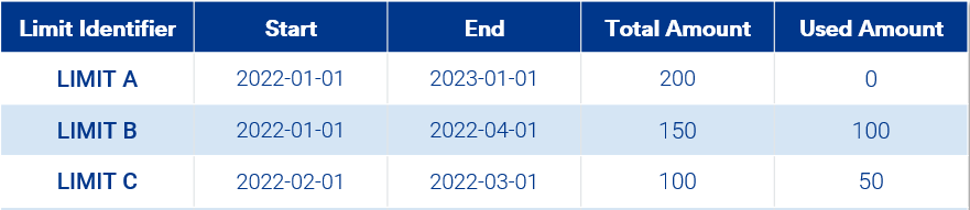 According to the regular credit limit method, the monetary value of each transaction would be independently subtracted from each concurrent credit unit. In other words, if the runtime of a transaction stretches over several simultaneously active credit limits, then each of those credit limits will be independently charged.
