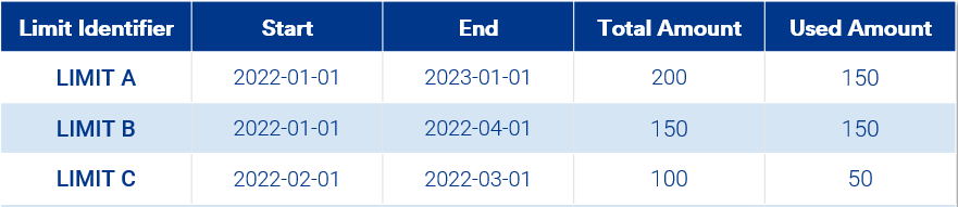 As in the previous transaction, T2, which cost 100 and runs for three months, will be divided in three due to the arrangement of your credit limits. In the first timeslice, 33,3 will be subtracted from Limit B, since it is the topmost limit in that period. Then, 33,3 will be charged from Limit C without spillover. Finally, the algorithm will attempt to deduct the final 33,3 from Limit B. However, that would bring its used amount to 166,6 while its total amount is 150. So, 16,6 will spill over to Limit A.