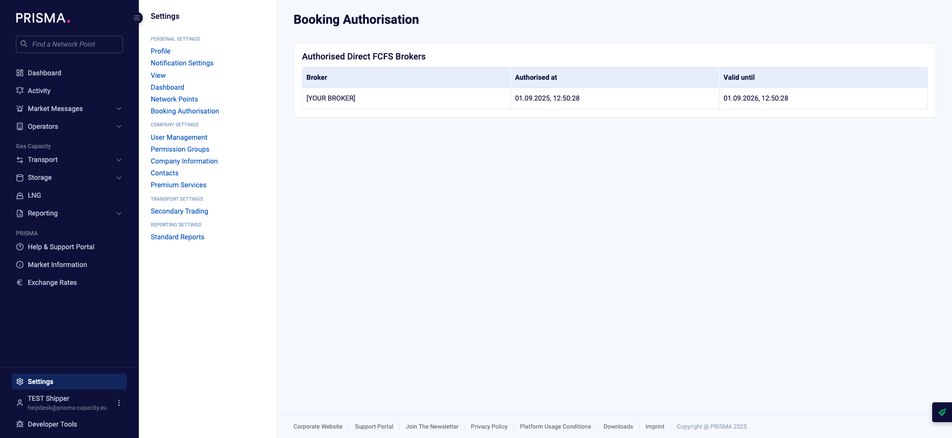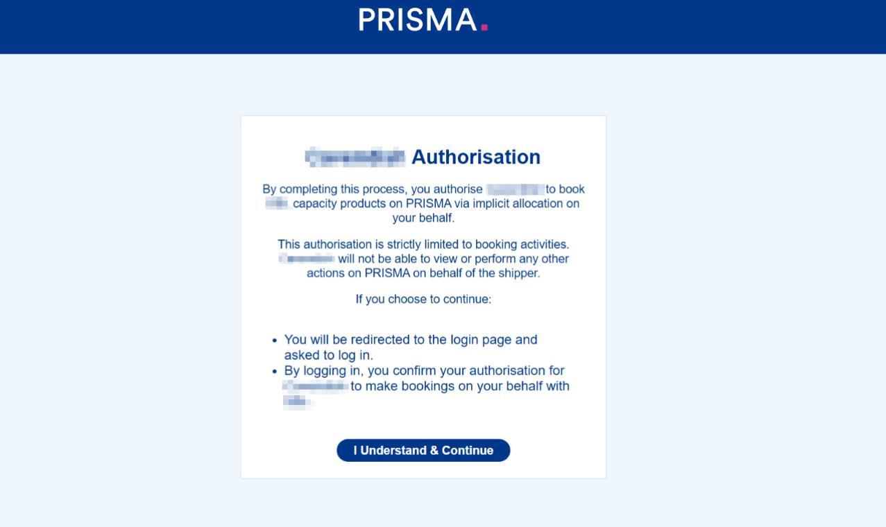4. After entering your credentials and confirming, you will be redirected to the broker’s page. The broker is now authenticated to place reservations and book transport capacity with the operator on your behalf.