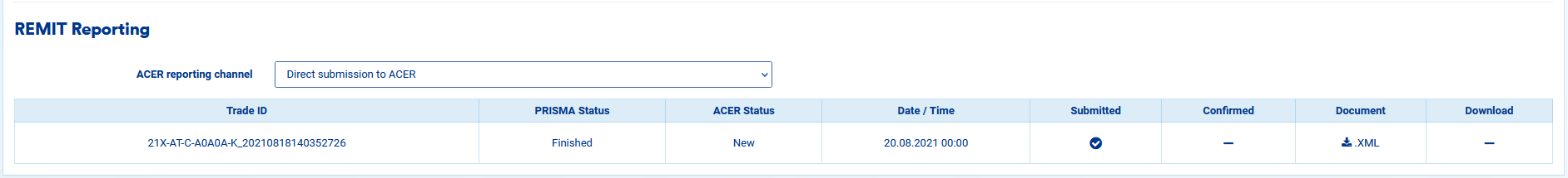If your company is activated for the REMIT reporting and allowed to enter external trades, every user of your company can download the reports sent to ACER as well as the related receipts received from ACER.