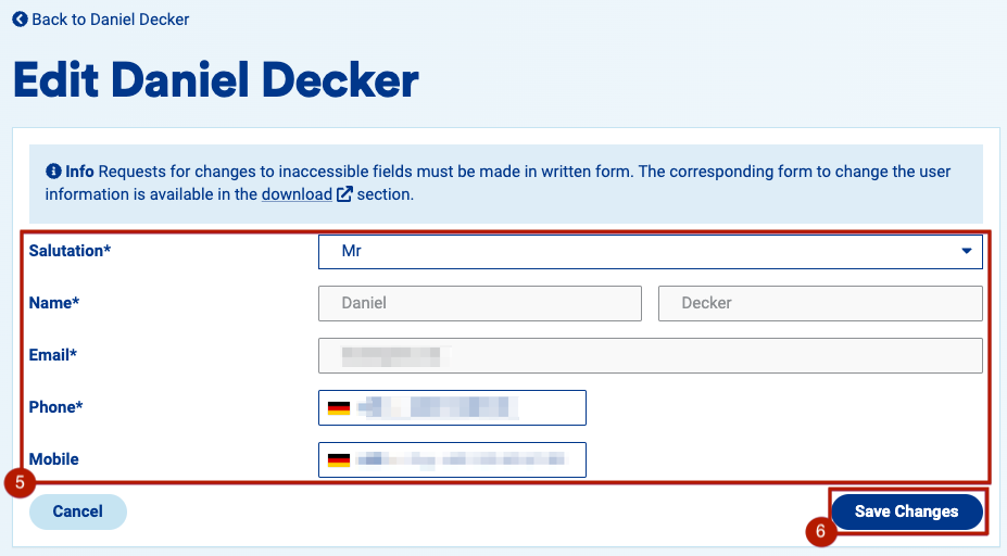 5. You will be able to edit salutation and phone numbers of the user; any other changes will have to be requested to the Customer Success Team at helpdesk@prisma-capacity.eu via the relevant Form 3.