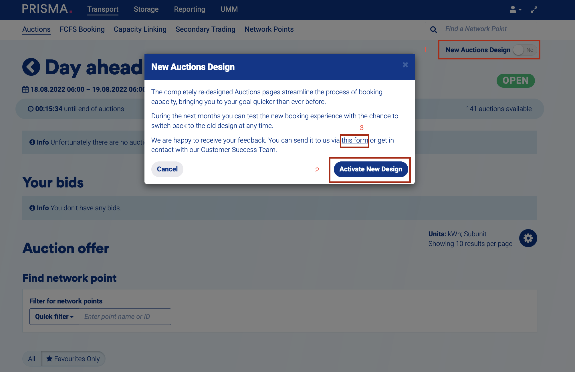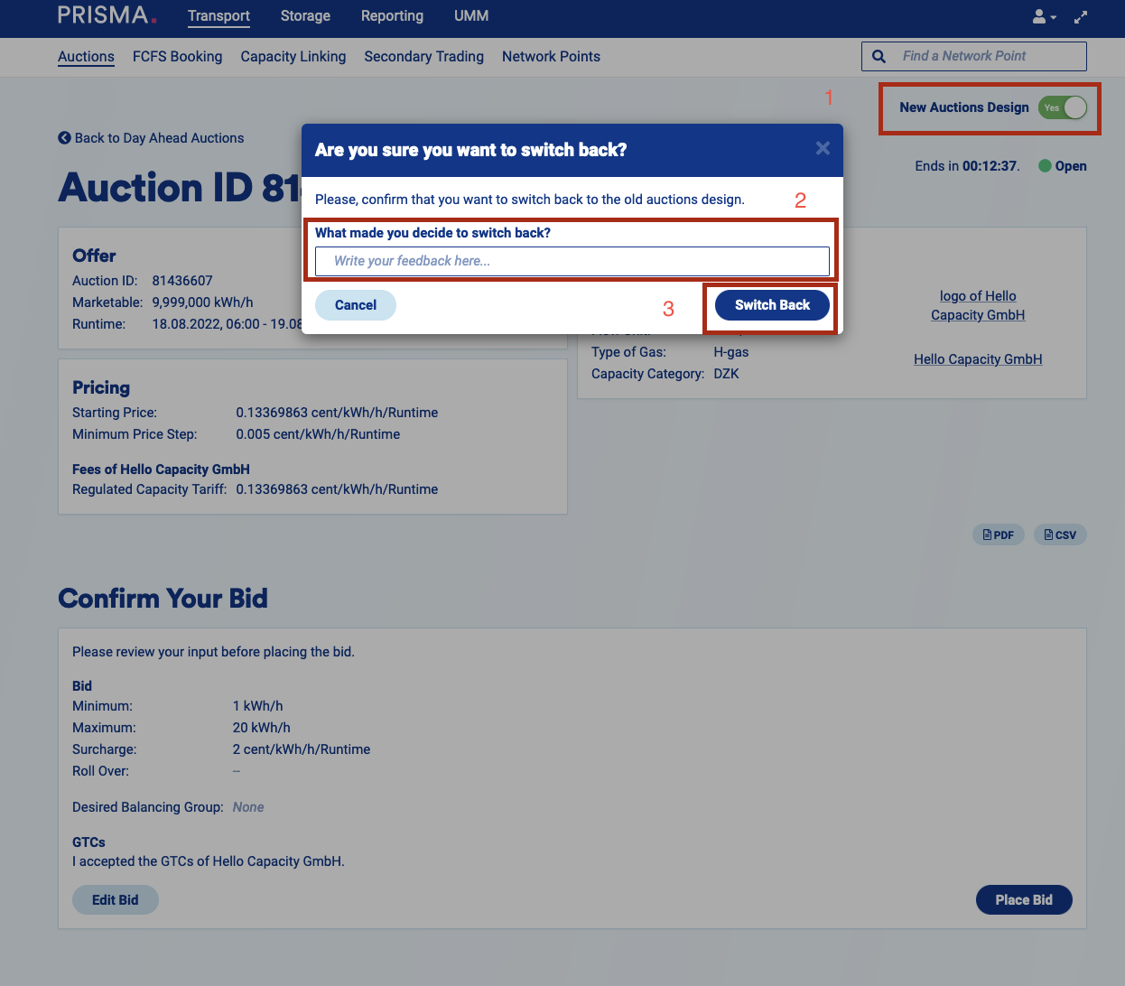 1. After logging into the platform and clicking on "Join Now" in an ongoing auction type, click on the switch in the top-right corner of the page;