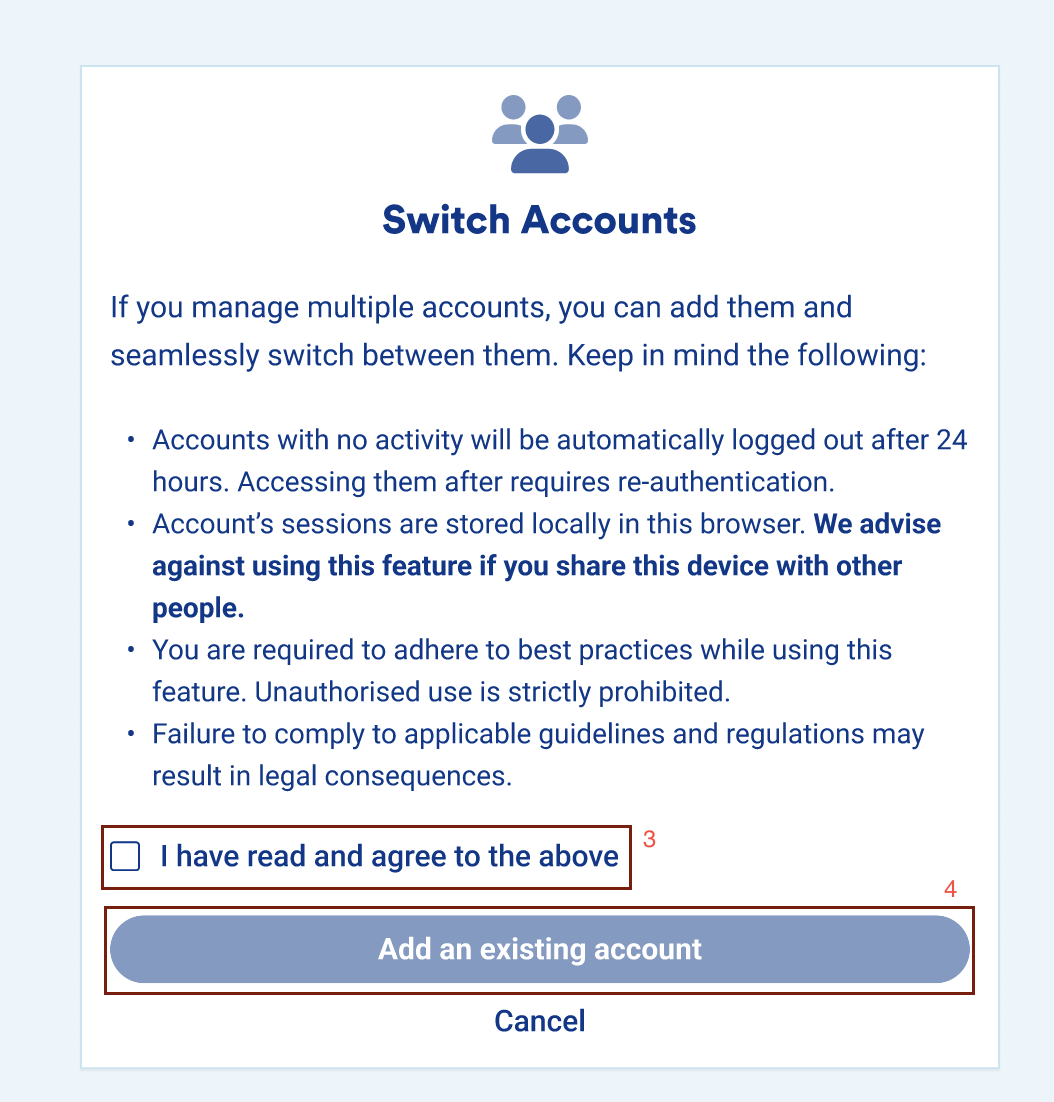 After you log in with another account, both accounts will be stored in your browser, and you will be able to easily switch between them by clicking on "Switch Account" as described in step 2, and then clicking on "Use" next to the account you wish to use: