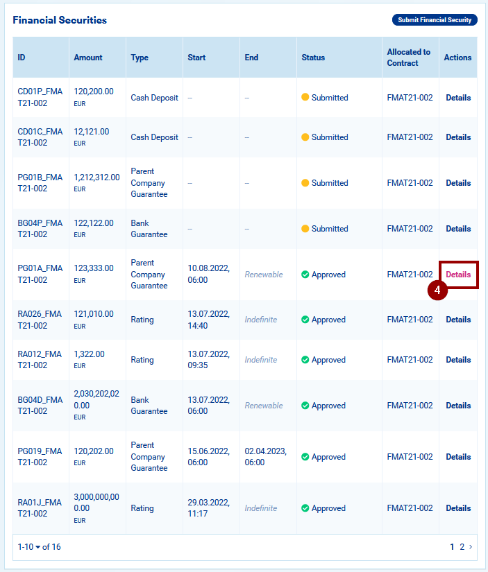 4. Then, on the Operator Details page, scroll down and click on "Details" in the row of the relevant financial security;