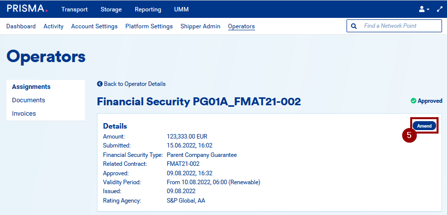 If you have an approved financial security of the parent company guarantee type, you may amend its quantity when necessary. This can be done directly on the PRISMA platform. After you do so, the TSO will then evaluate the amendment and either approve or reject it.