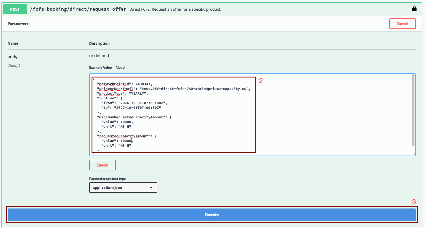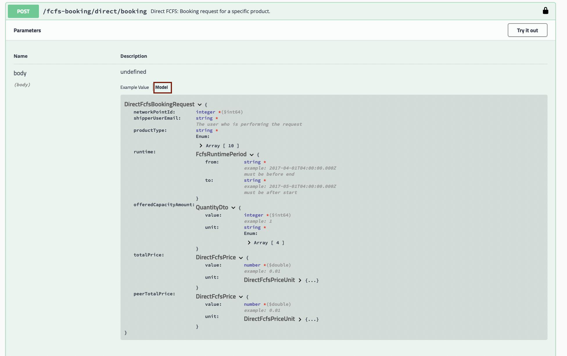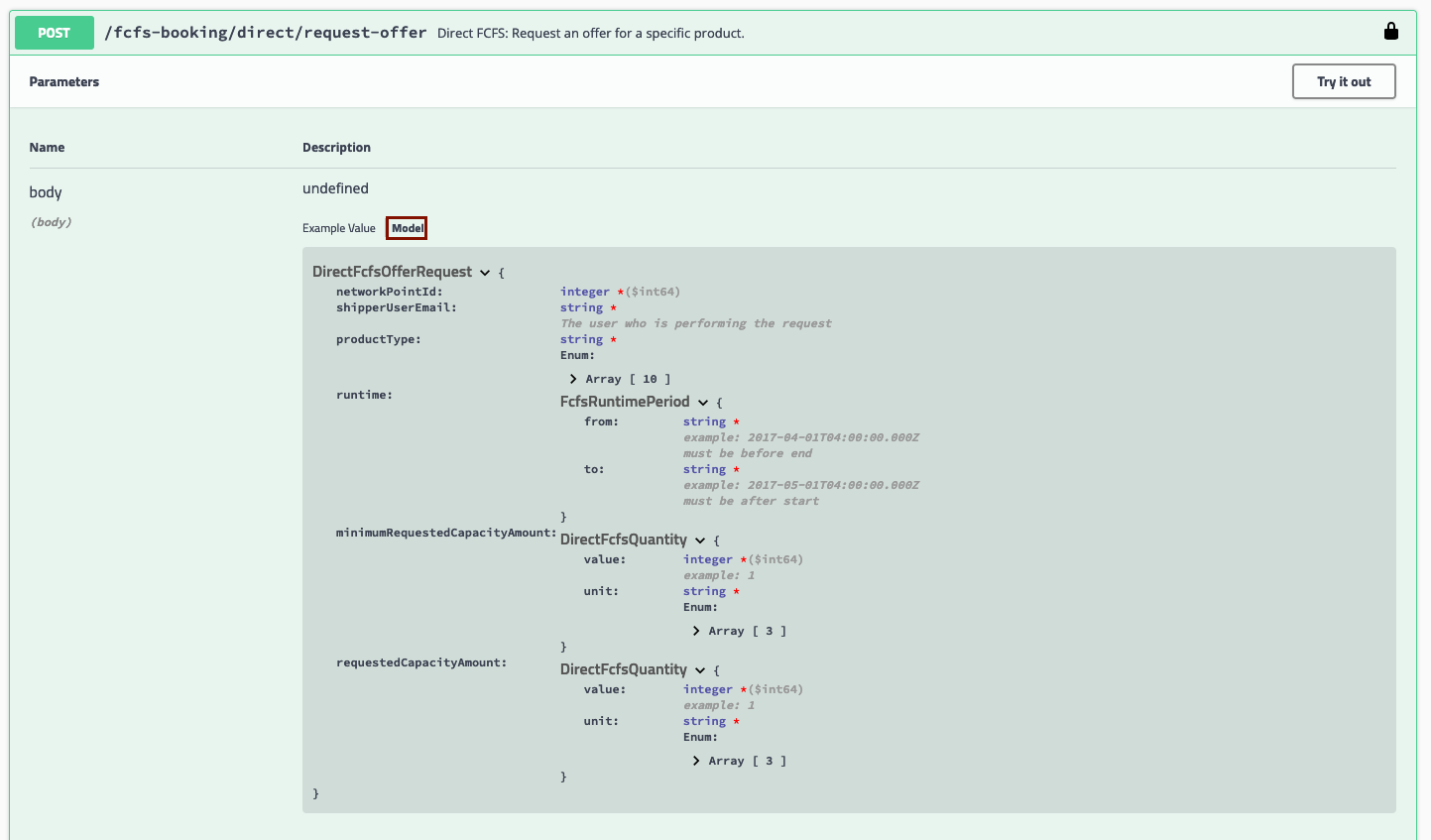 Once you have the necessary details of the offer, you can submit your direct FCFS booking. The mandatory fields of this json message (marked by an asterisk) can be viewed in the "Post/fcfs-booking/direct/booking" tab after you click on "Model:"