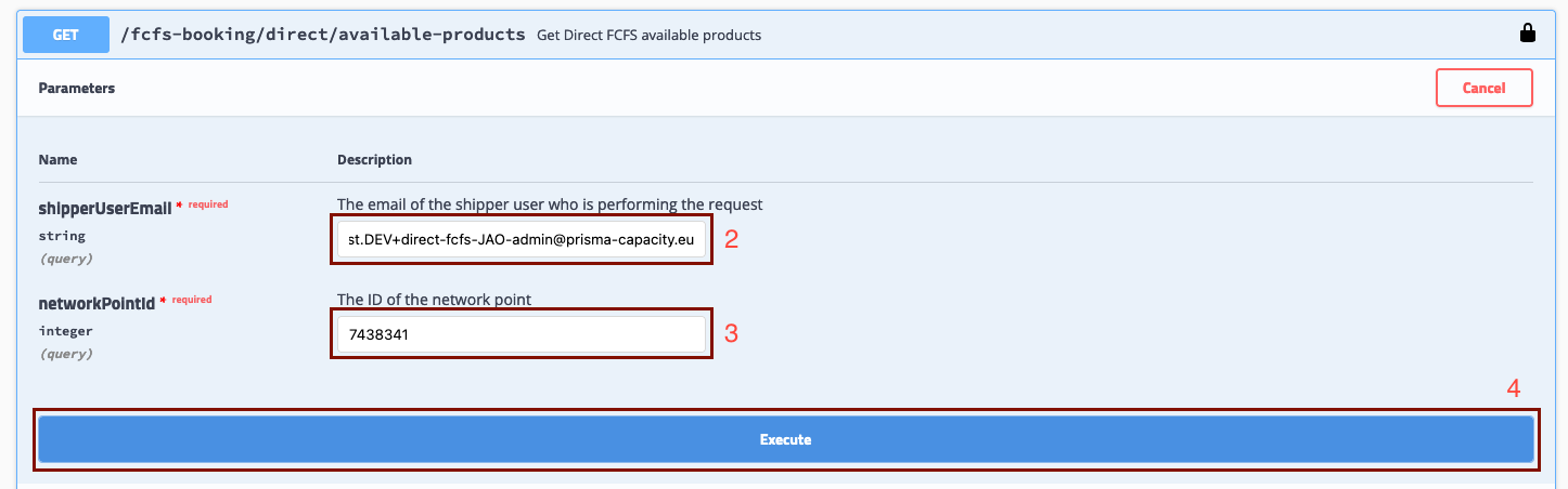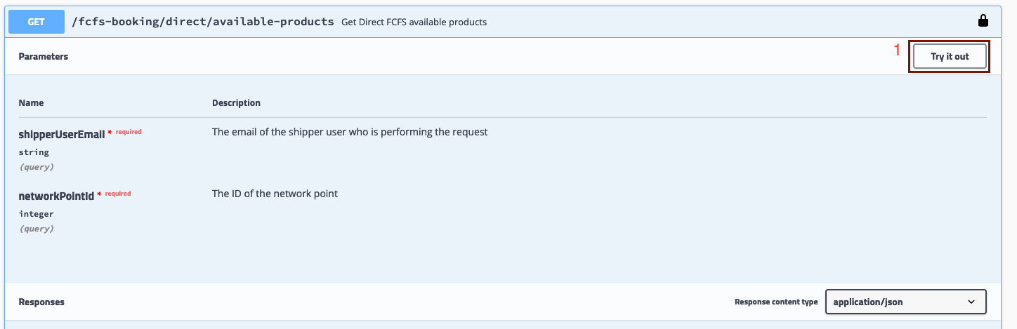 1. Expand the "Get/fcfs-booking/direct/available-products" tab and click on "Try It Out;"