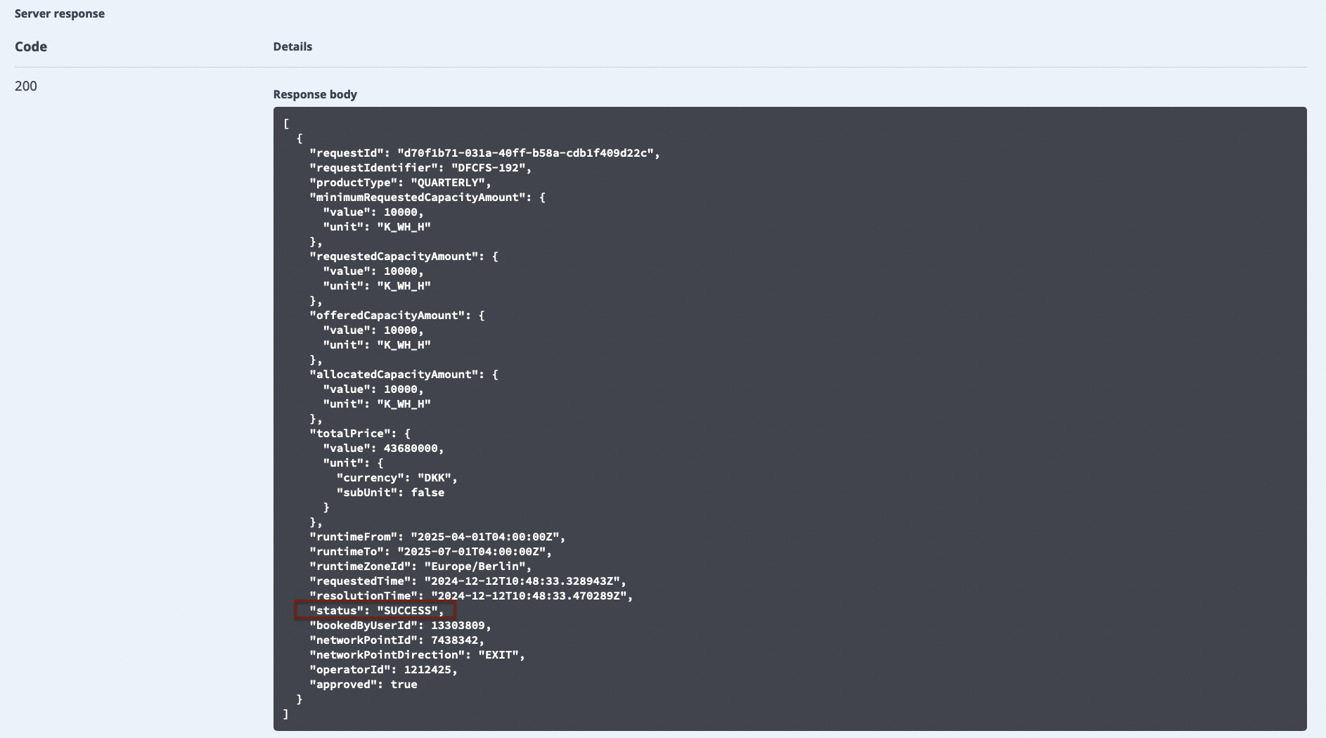 The resulting message can be viewed in the "Response" field. The status of your booking will be displayed in the "Status" line: