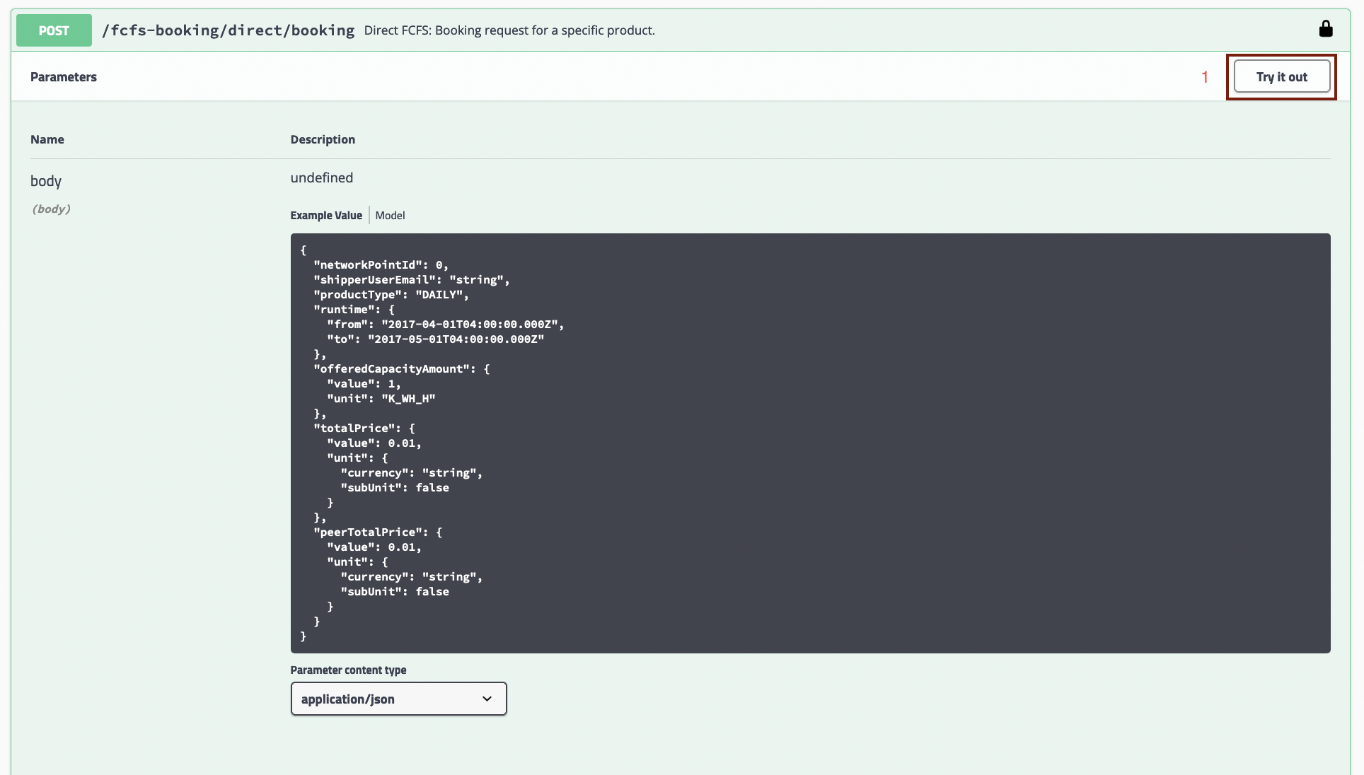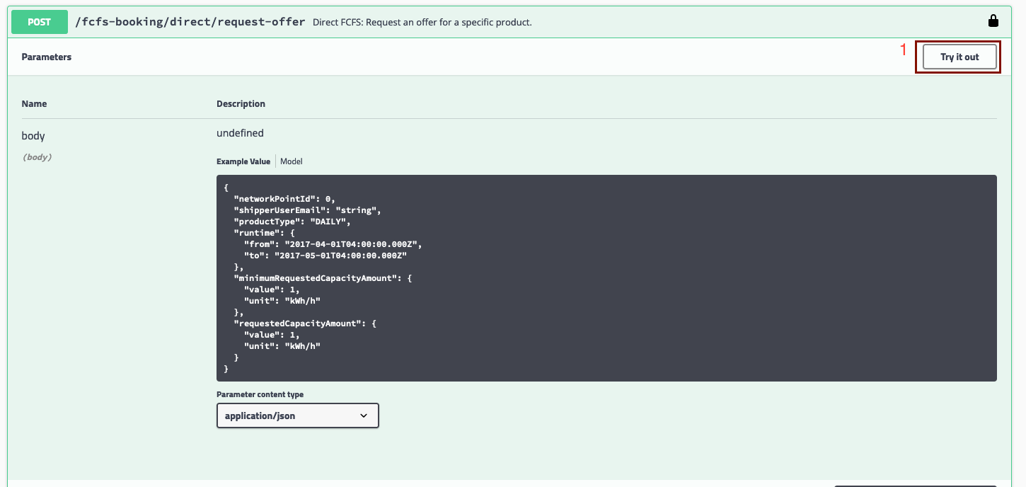 1. Expand the "Post/fcfs-booking/direct/request-offer" tab and click on "Try It Out;"