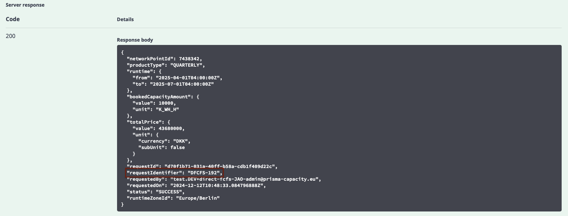 The resulting message will be displayed in the "Response" field. It contains all the details of your booking request including the Request Identifier, which you can use to check the status of your Direct FCFS Booking: