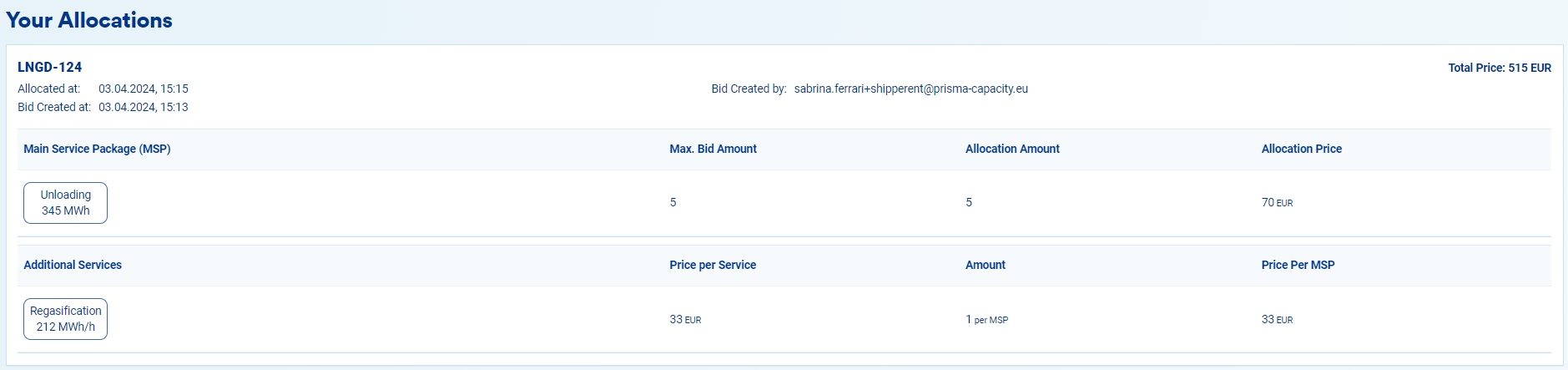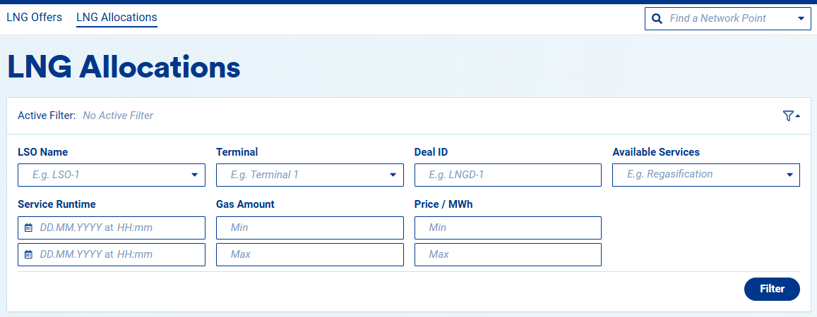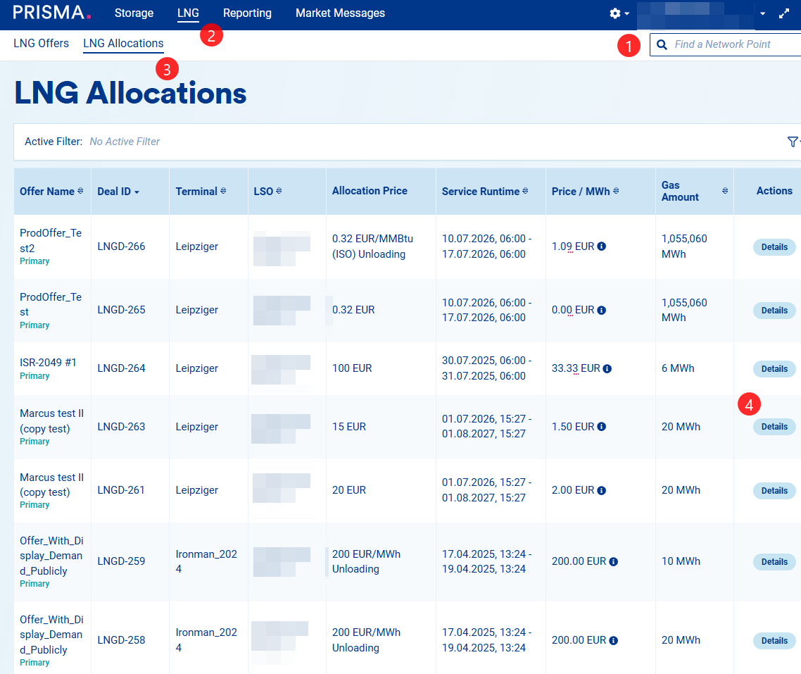 As a shipper user, you can view your company’s allocations in the LNG section, under the LNG Allocations tab. There, you will find all information related to your allocations. Please note that you must have a valid assignment to the LSO, or the permission “Read LNG allocations as a shipper”, in order to see these details.