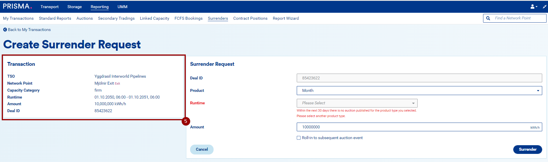 10. The box Roll-in to subsequent auction event is unchecked as default, but it can be checked and is optional for all surrender requests that have a runtime higher than one day.