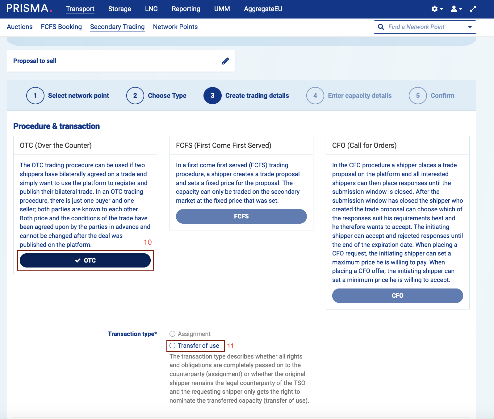 11. Choose "Transfer of Use" as the transaction type. In Transfers of Use, you remain the legal counterparty of the TSO and merely transfer nomination rights to the buying shipper, which, in turn, becomes your legal counterparty.