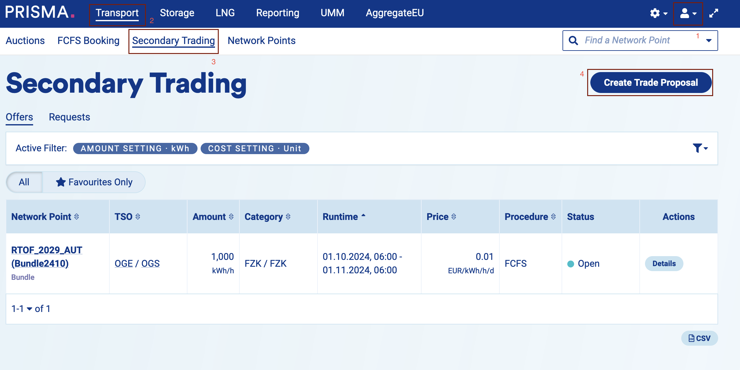 13. Enter the details of your offer, including capacity amount, runtime and price. Then, enter an expiration date for the proposal and the trading conditions. Please ensure that your counterparty has enough time to respond to your trade.