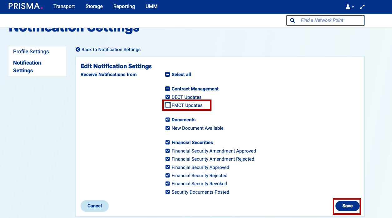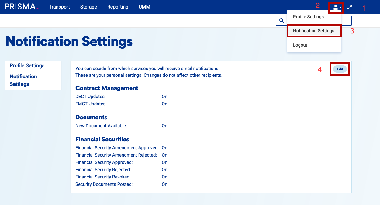 If a TSO to which you have an assignment subscribes to the contract and/or capacity management module, you can manage the notifications you wish to receive about contracts, documents and financial securities. If the notification for a certain event is activated, you will receive emails whenever that event occurs.