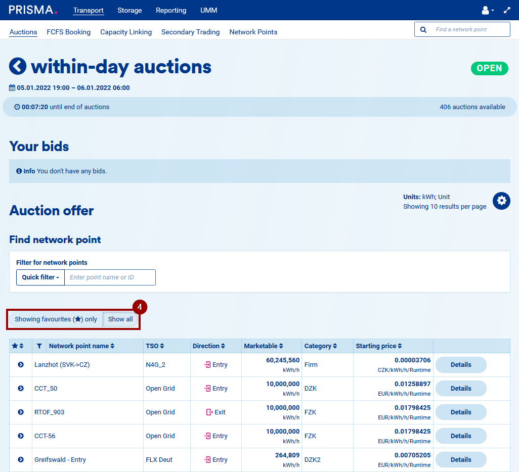 6. You will notice that you can see the details of all auctions, but you can only place bids in auctions offered by TSOs you have an active assignment to.
