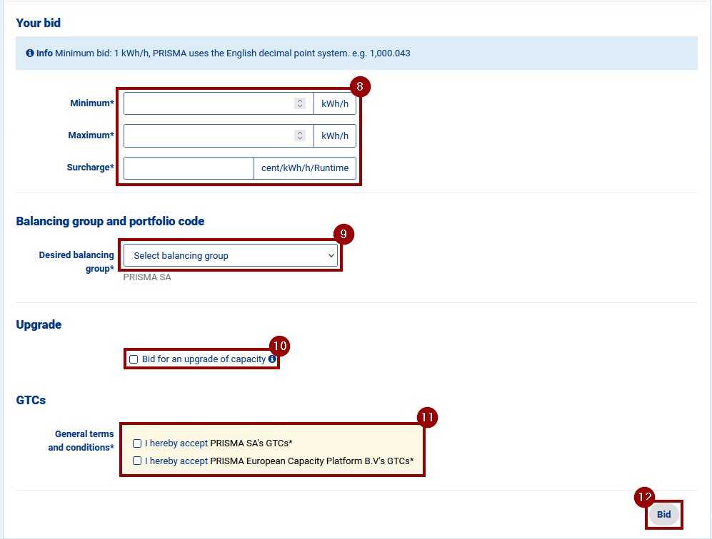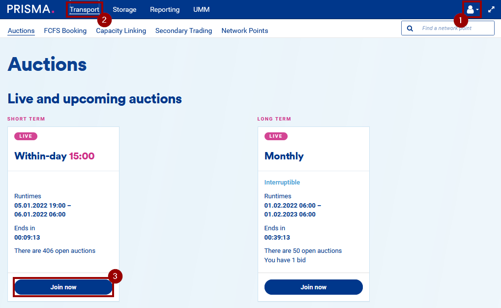 On PRISMA, you can to participate in short-term auctions. These auctions can be either day-ahead or within-day auction and they both use the Uniform Price Algorithm to determine allocation and capacity price: Uniform Price Algorithm