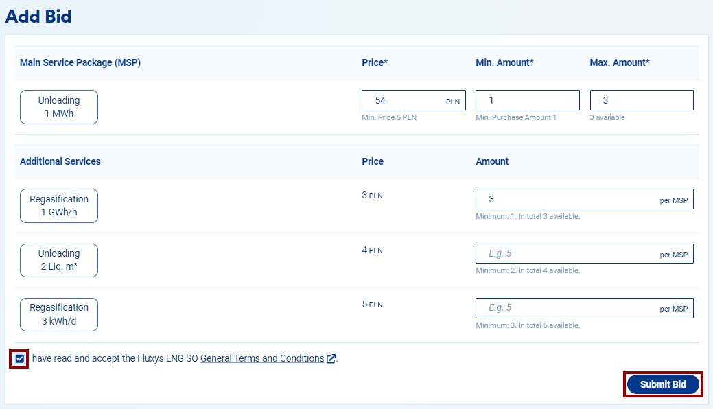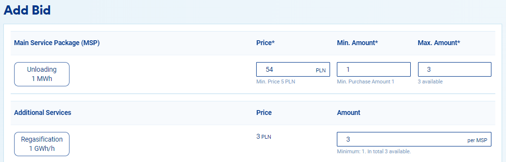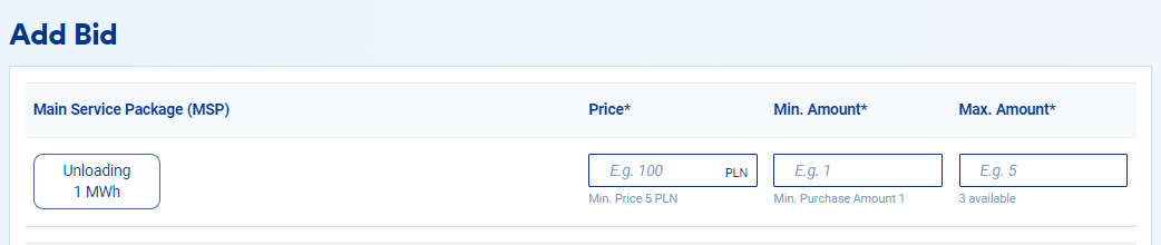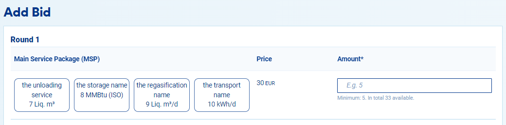 5. In the bidding screen, you need to specify a minimum and a maximum number of Main Service Packages (MSP) you would like to acquire and the price you are willing to pay. Your price must be higher than or equal to the reserve price if set by the LSO.