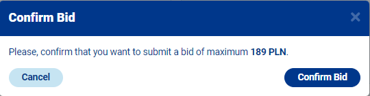 8. A confirmation box will pop up, summarizing the bid details and explicitly stating the maximum total bid price in the terminal's currency. If you wish to proceed with placing the bid, click on "Confirm Bid", otherwise select the X in the top-right corner to go back to the bidding screen.