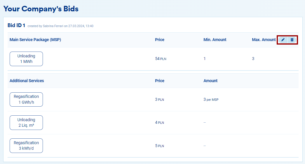 9. After you have confirmed your bid, you will find it in the offer details page and you can edit or delete it as long as the bidding window is still open: