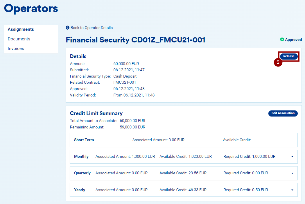 If you have an approved cash deposit financial security for a frame contract, you can decide to release a part or the full amount of it, so that you can use your liquidity for other activities.