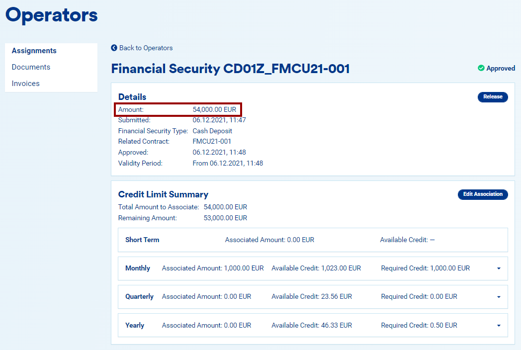 9. Once you have clicked on "Submit", the specified amount will be released and the financial security will be updated with the new value.