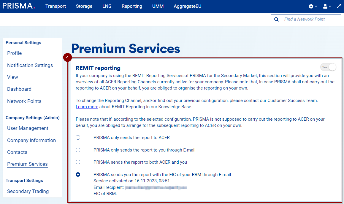 If your company has subscribed to our REMIT Report Premium Service, you can check your subscription details and REMIT reporting channels on PRISMA. This article will explain how to do this on the platform.